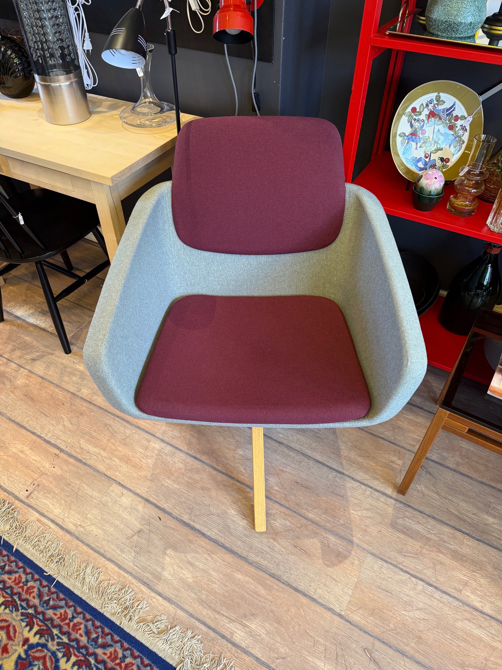Arca nojatuoli on tyylikkään siro ja ryhdikäs. Tuolin runko on verhoiltu harmaalla kankaalla ja irrallinen istuintyyny sekä kiinteä selkätyyny ovat burgundinpunaista verhoilukangasta. Jalat ovat massiivitammea ja ne in kiinnitetty pyörivään nelijalustaan.