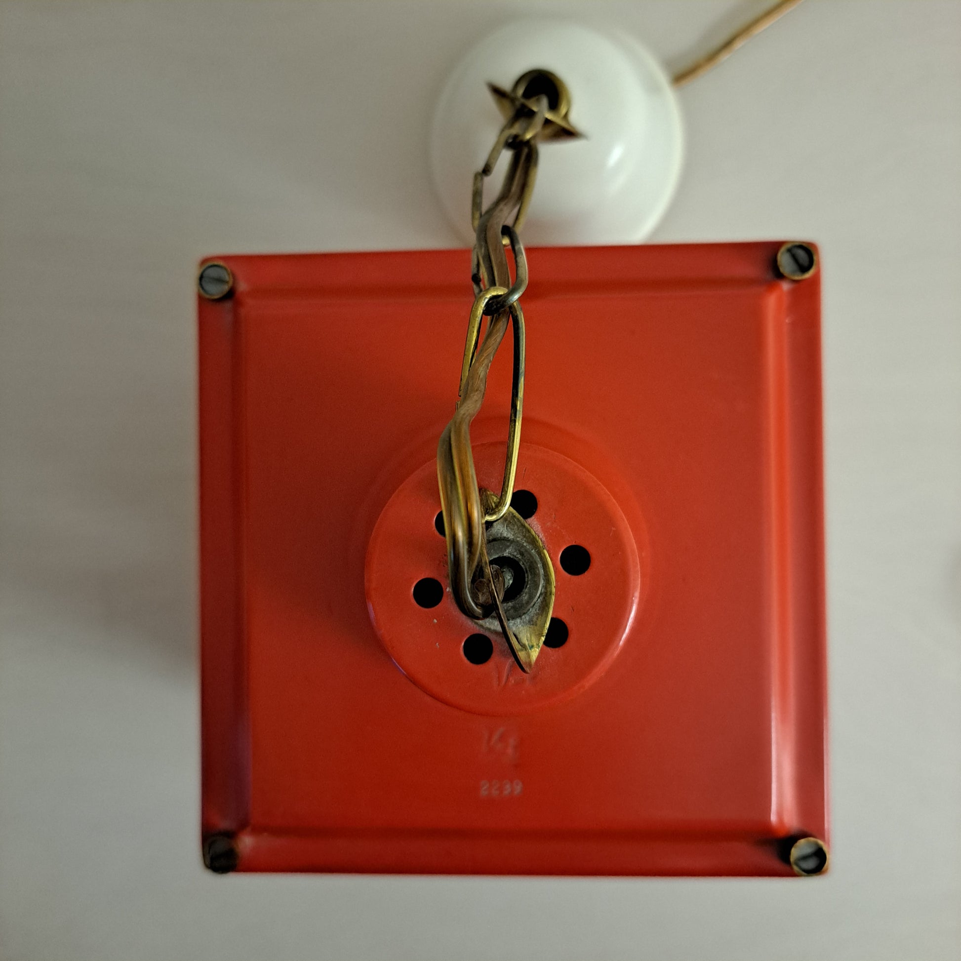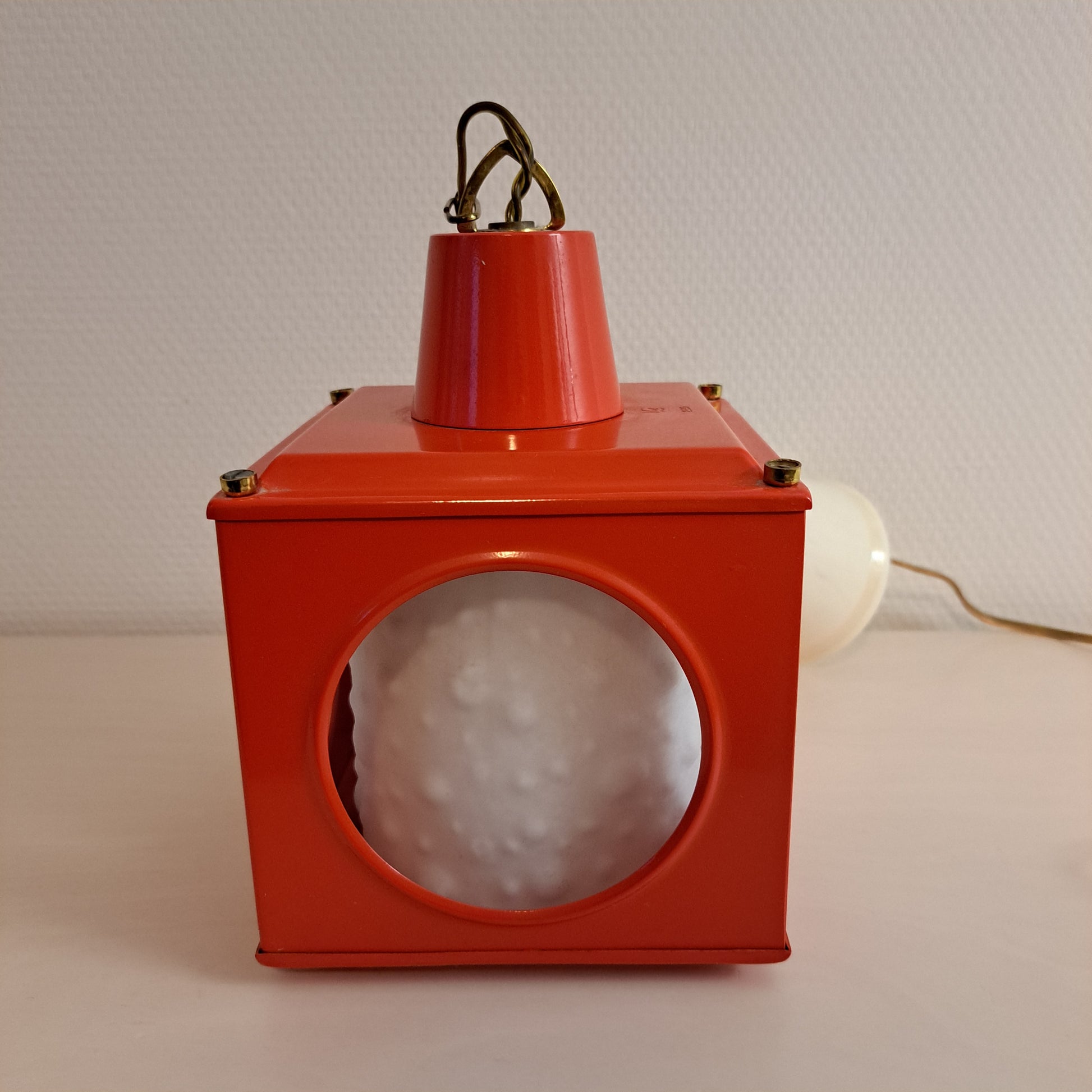 Sympaattinen, kotimaisen Valinten valmistama riippuvalaisin tuotenumerolla 27103. Valaisimessa on punainen, metallinen neliönmallinen runko ja kupu on valkoista lasia.