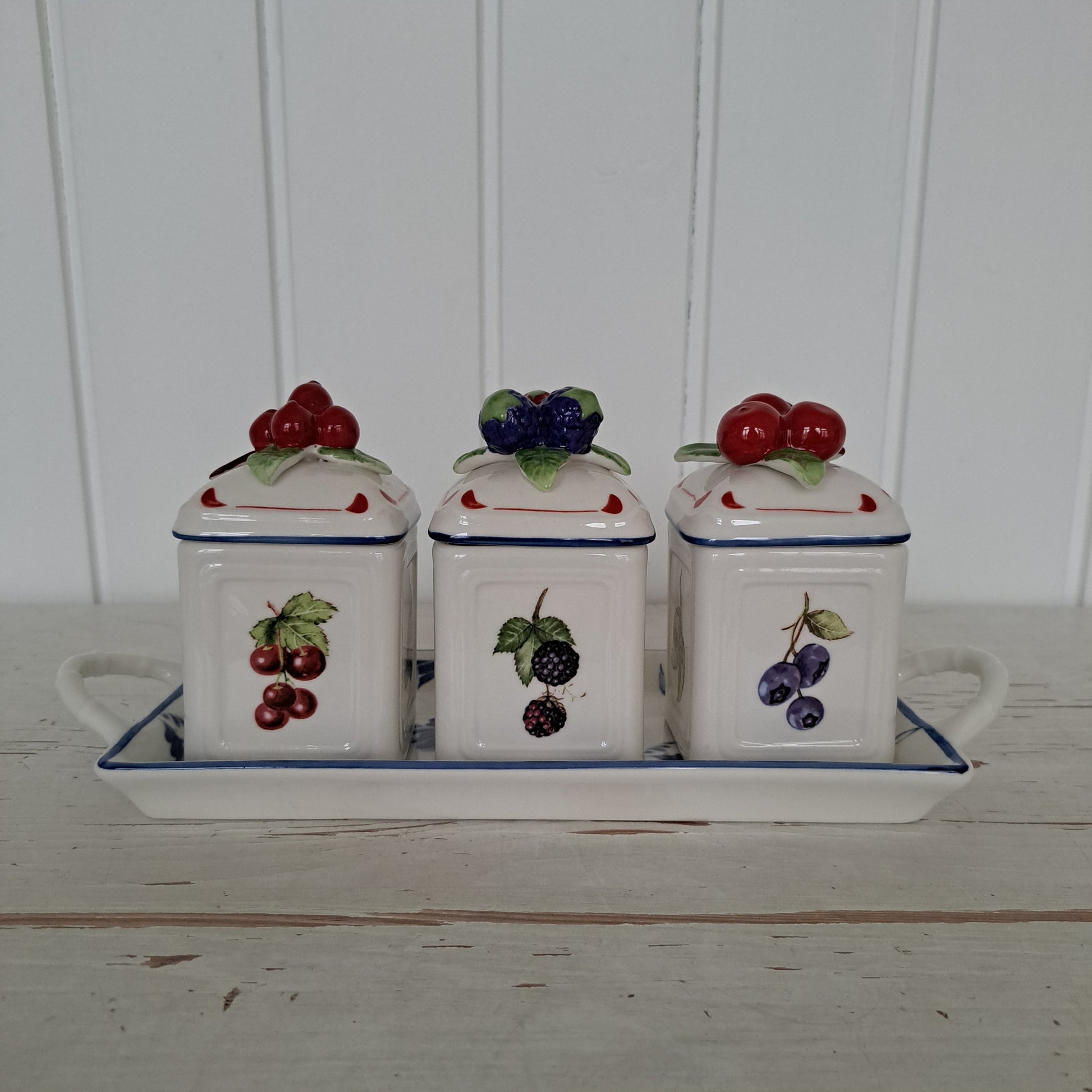 Villeroy & Bochin laadukkaat ja iättömät hillopurkit (3 kpl) sekä upea posliininen tarjotin.
