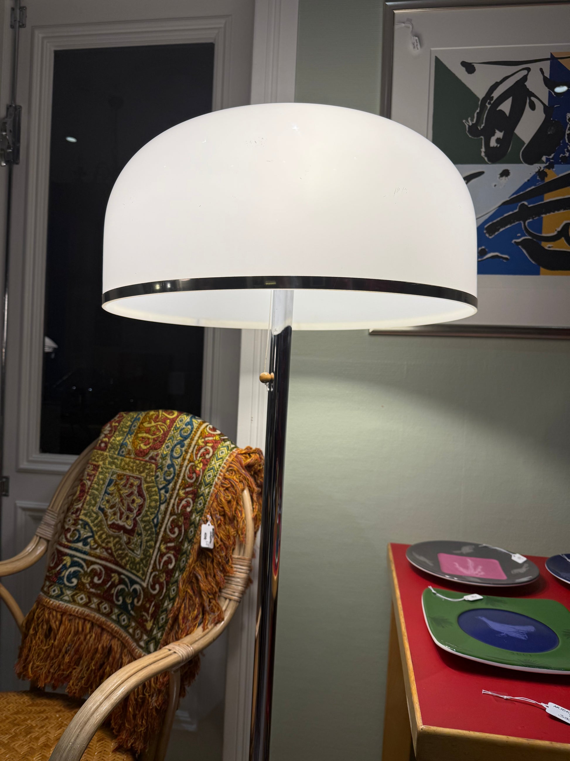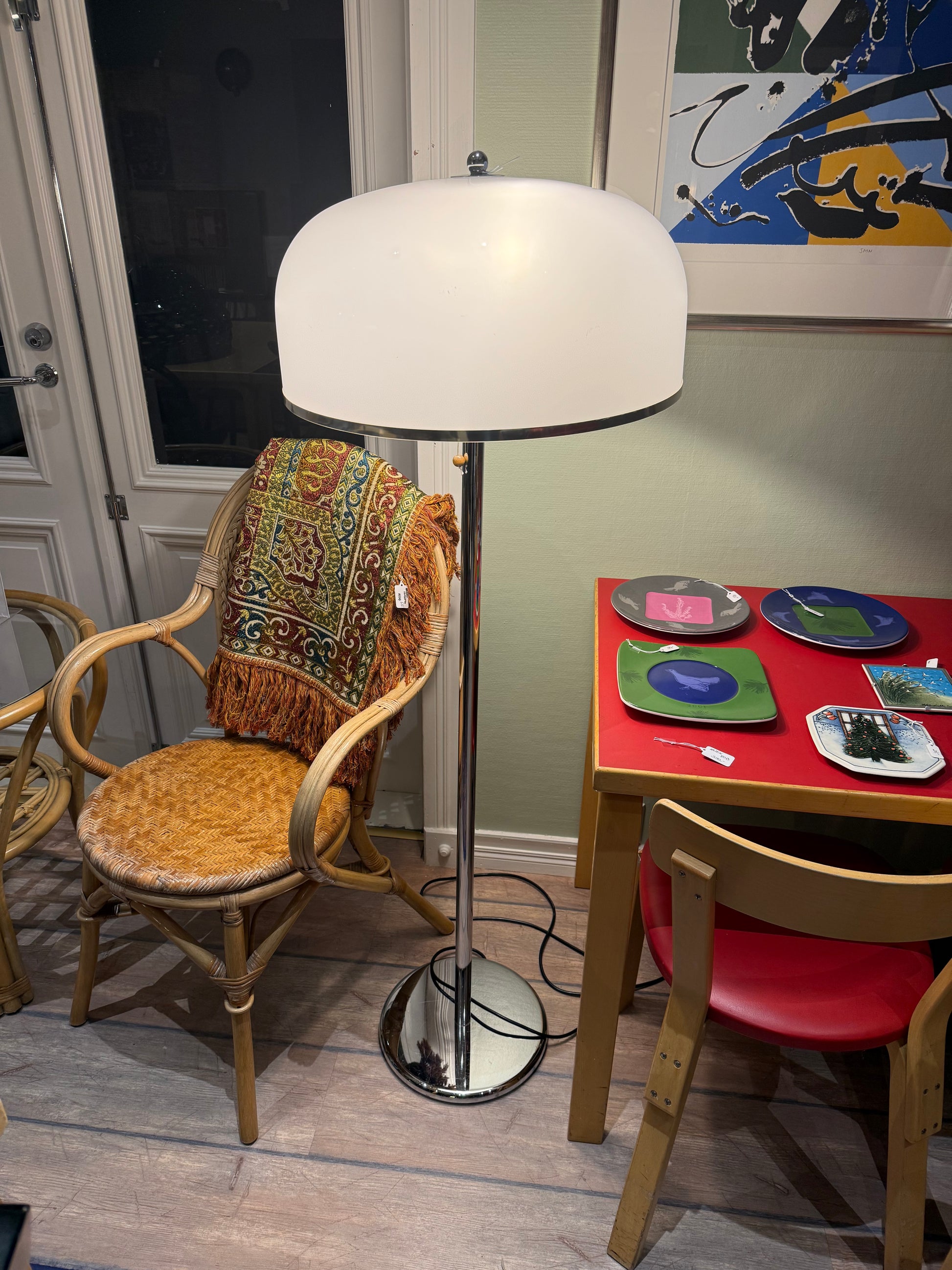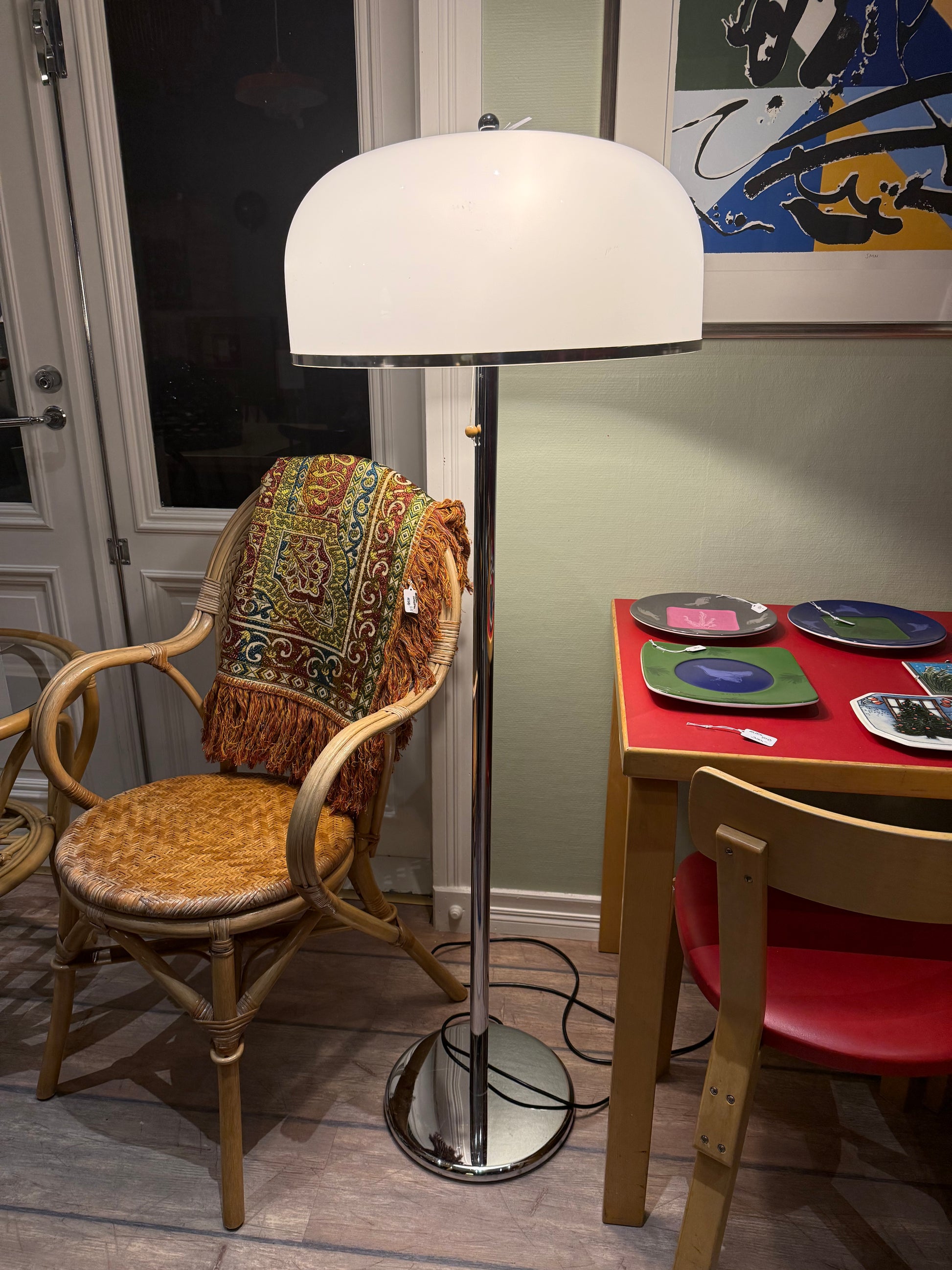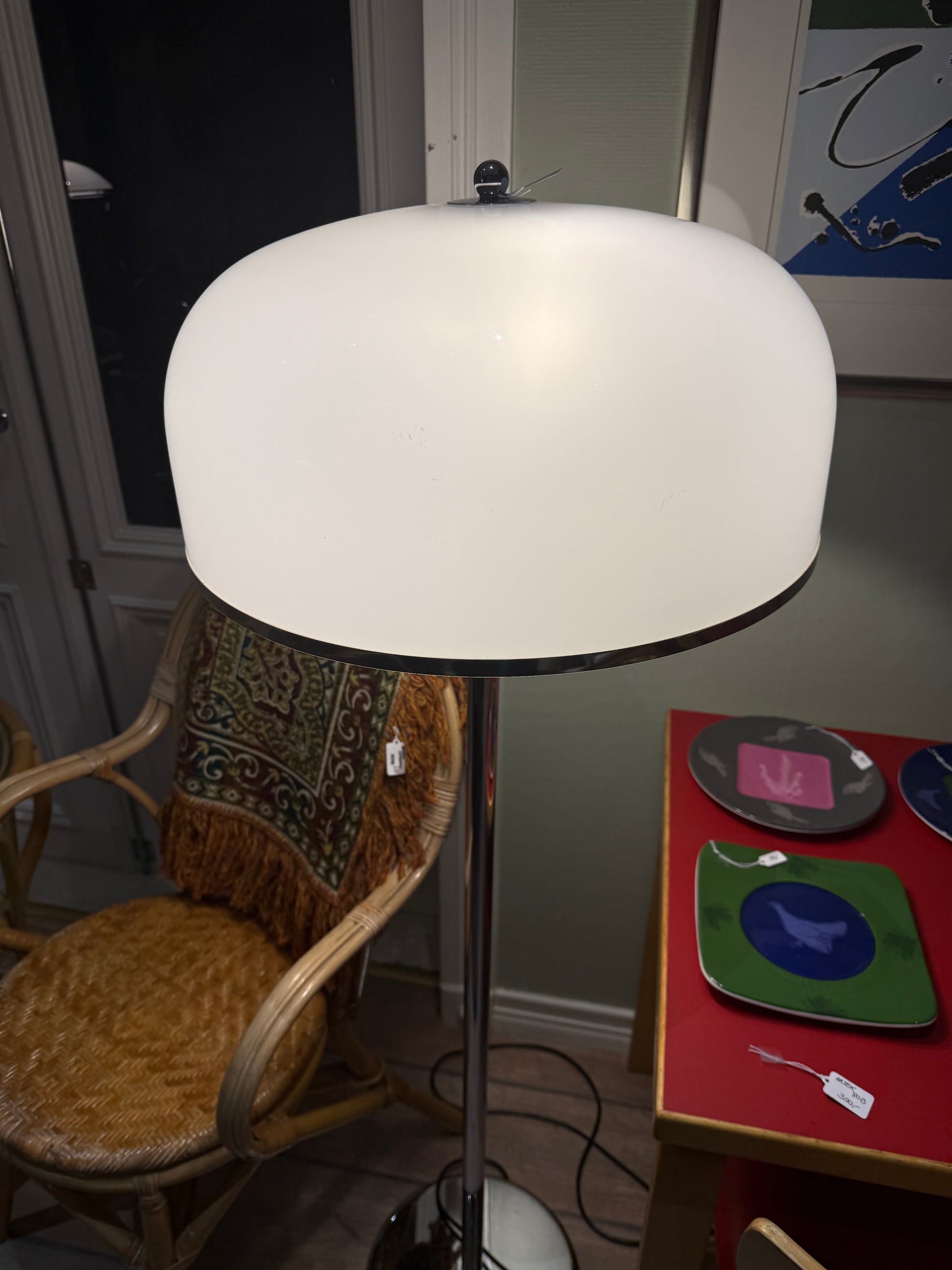 Näyttävä ja linjakas lattiavalaisin, joka muotoilultaan muistuttaa 1970-luvun skandityyliä. Suunnittelijasta tai valmistajasta ei ole täyttä varmuutta, mutta valaisin on itsessään tyylikäs ja loistavassa kunnossa!