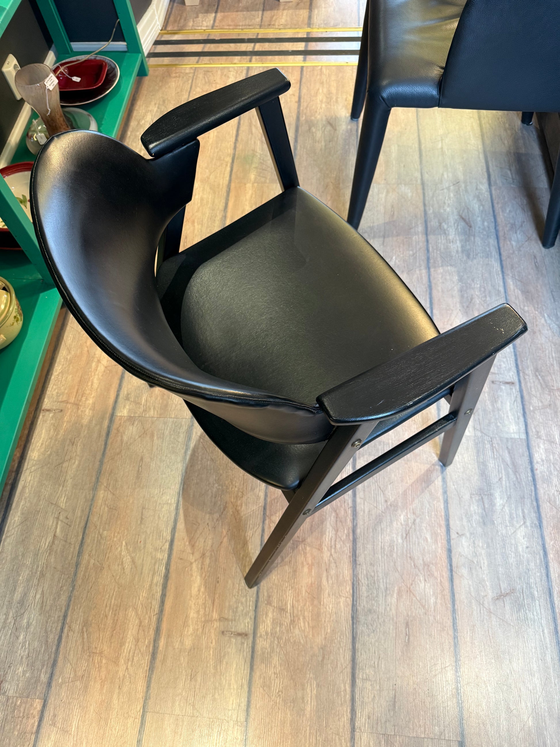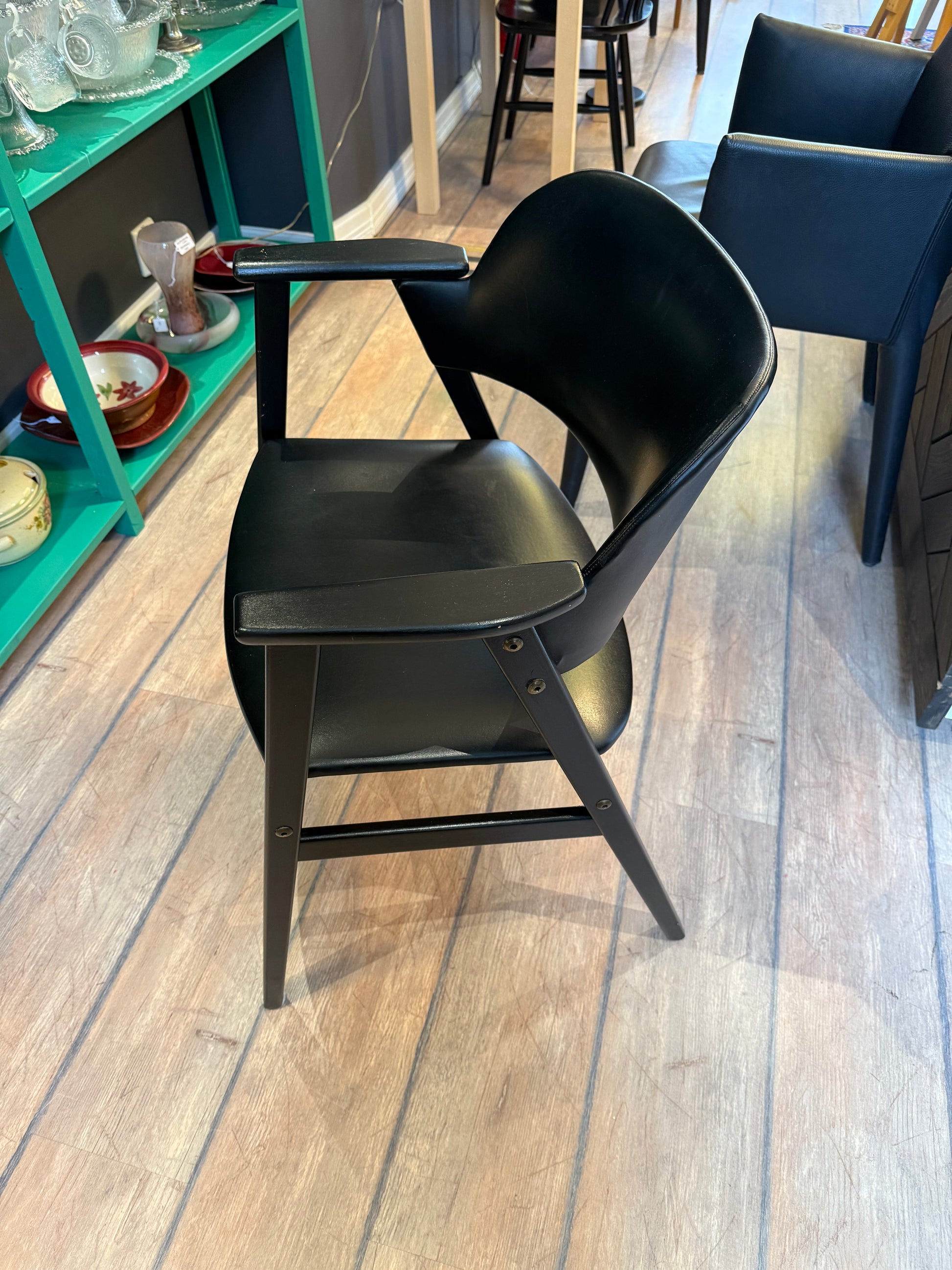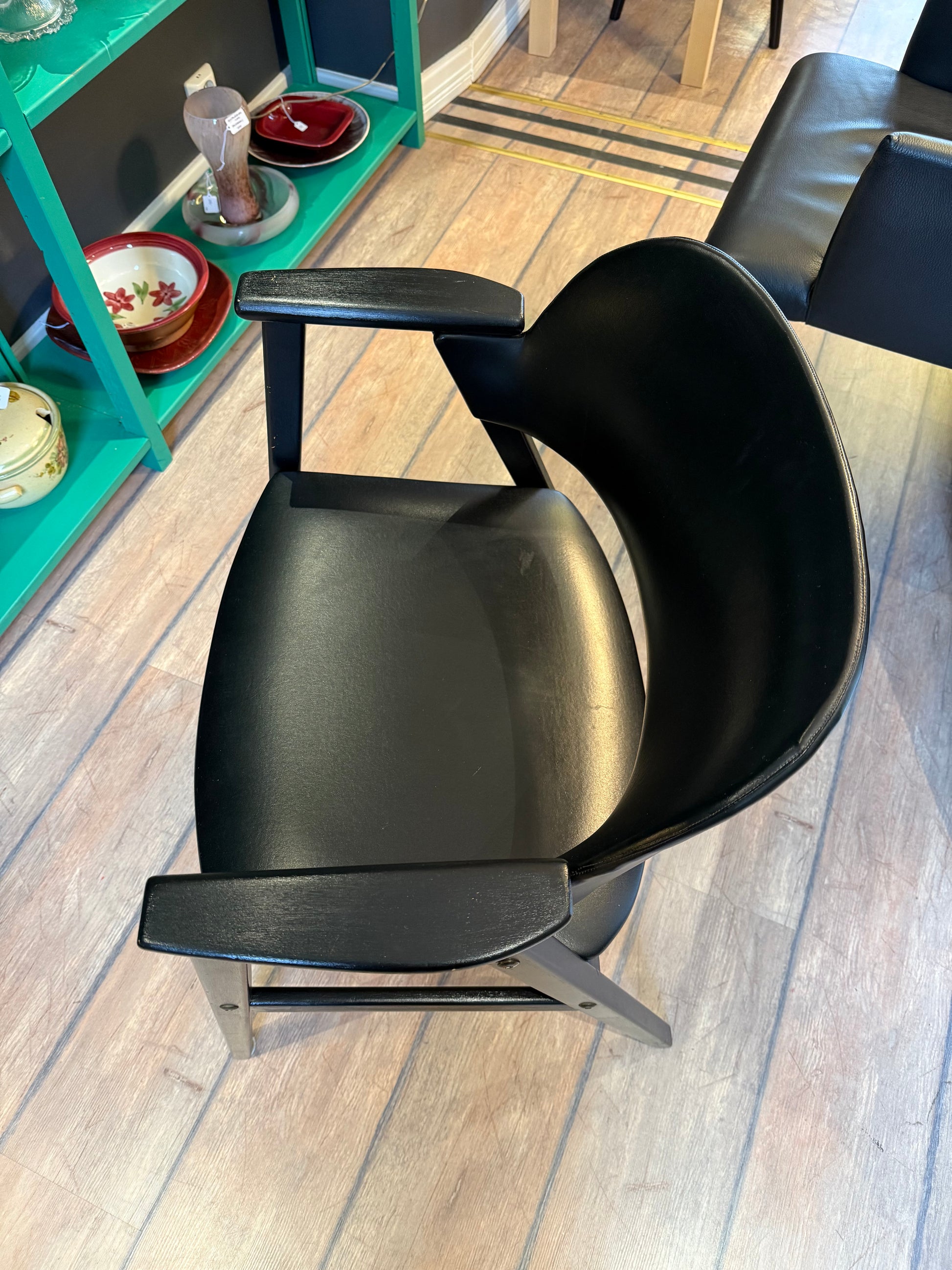 Vintage työtuoli 1950-luvulta, todennäköisesti Ruotsista. Tuolin runko on mustaksi maalattua puuta ja istuinosa sekä selkänoja on verhoiltu keinonahalla. Tuolin muotokieli muistuttaa meille niin tuttua Aslak-tuolia.